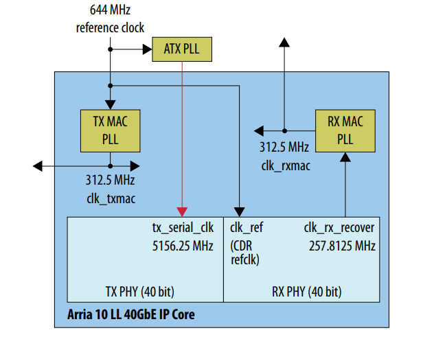 I'm trying to evaluate the Low Latency 40G Ethernet core in a VHDL based design. The settings of the core are the same as the example design. I've instantiated the ATX PLL that comes with the core upon HDL generation via the QSYS parameter editor. There are no other blocks in the design, the intent is to take this wrapper and instantiate in a test bench for simulation.