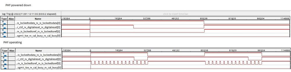 Since receiving data is working, but with about 50% packet loss. I assume the CDR is not able to sucessfully lock to the incoming data. Is my assumption correct or is something else causing the rx_is_lockedtodata toggling with a constant rate? Why does the period of rx_is_lockedtodata change depending on if a SGMII RX signal is present or not? How can I verify transceiver calibration was successful? Are there any possibilities to debug the CDR?