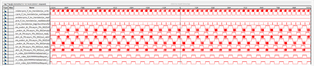 Because the data sink (PCIe IP) runs at a higher clock freuqency than the data sources there should be no bottleneck inside the interconnect. Signal tap analyis revealed however that there is a bottleneck caused by the asyncronous FIFOs. Because they have only depth 8 they can only buffer very few data (not even 1 burst) while the cmd_mux streams data from the other AVMM master.