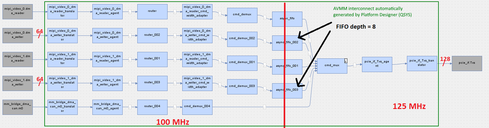 Two Avalon masters (called dma_writer in the above image) have data width 64 bit, run at 100 MHz and simultaneously perform burst write transactions of 32 words. The input of the PCIe IP has data width 128 bits and runs at 125 MHz.