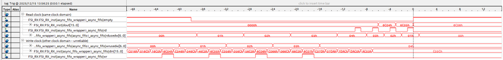 The FIFO is configured as separate write and read clocks, it is 32 words deep.