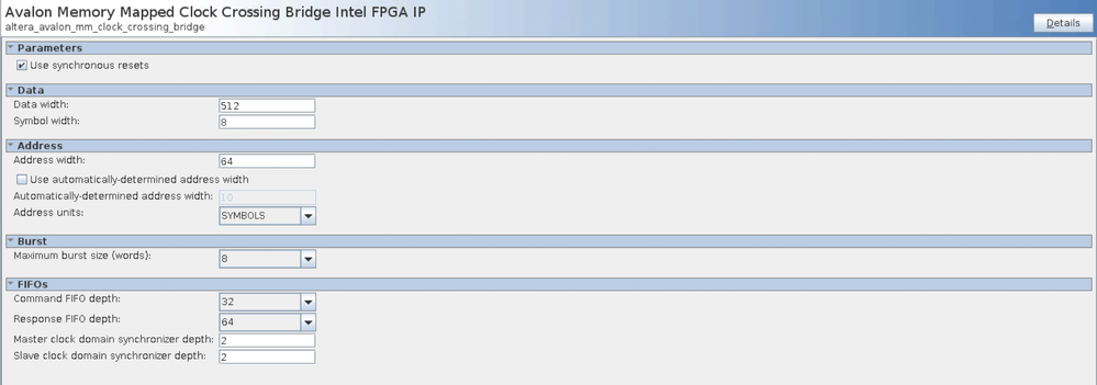 Furthermore I saw I can edit the maximum pending read transactions on the DDR4 EMIF core & on Avalon Clock Crossing Bridges but not the maximum pending write transactions. Is there a reason why I cannot edit these parameters in those IP cores?