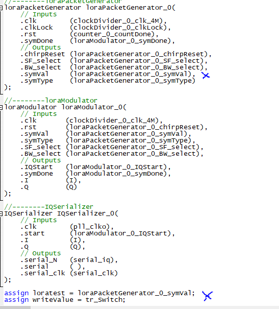 You will see from the pictures an output called loratest and this is the data that im sending to the other board. Now my question is how can i get the output symType from the module called loraPacketGenerator to the top module so i can send the data?