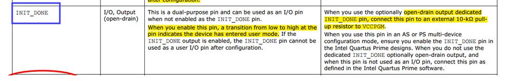 Although INIT_DONE is an Open-Drain output, however, A10 pin-connection guide.pdf page10 writes that this pin should be pulled up with 10K to VCCPGM, as below picture.