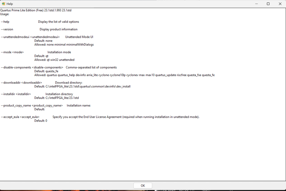 dev_install.exe --unattendedmodeui none --mode unattended --downloaddir c:\intelFPGA_lite\23.1std\quartus\common\devinfo\dev_install --accept_eula 1