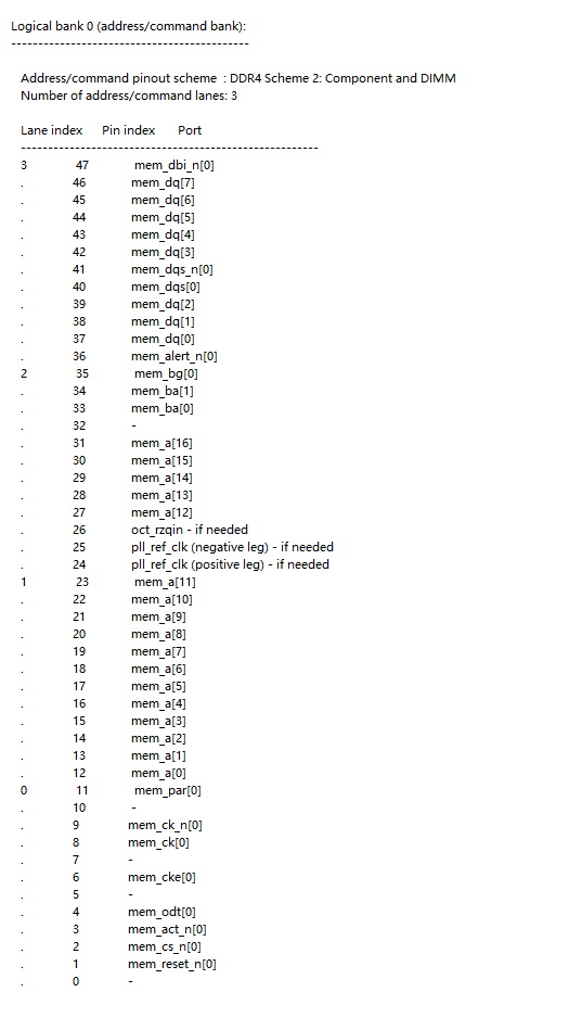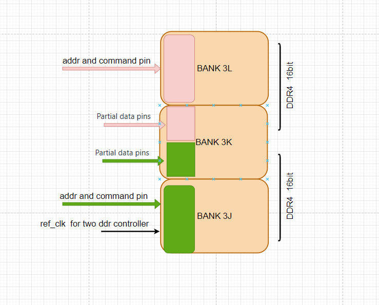 I will use two 16bit ddr4 controller, the readme.txt file show a example I/O assignments, if this one controller will occupy two banks, total 4 banks. Two controllers working at same frequency, I want to connect PLL reference clock signal from bank 3J to two pll_ref_clk of controller instances in top.v file, and place some DQ signals of two controllers in bank 3K, place addr and command signals of two controllers in bank 3J and 3L. So, I can place two controllers in total 3 banks. I'm not sure if it's possible to do this ?