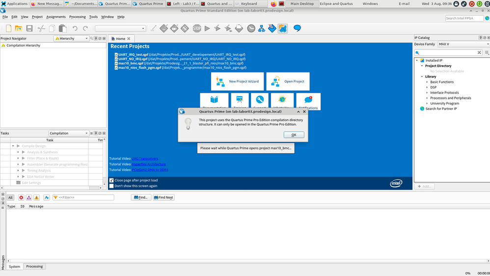 After this, I can still use the output files(.sof, .pof) with no issue. However, I can no longer open the project in the GUI. If I open it in Quartus Standard, the error states this was built in quartus Prime Pro and must be opened there. If I try to open it in Quartus Prime Pro it tells me that the MAX10 is not supported in Prime Pro and will not open it. So, essentially after command line compile, my .pof and .sof and .sopcinfo files are fine, but the project can no longer be opened so I can make changes/updates to Qsys...etc.