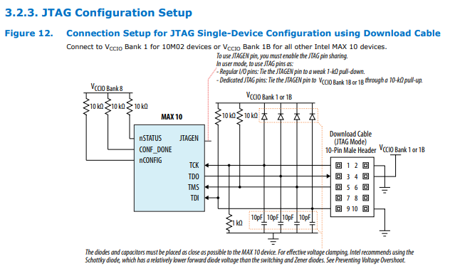 6 years agoHave you connected the JTAG pins with correct Pull-up/PD resistor values.. 10K .. Check the Max10 confguration guide here : https://www.intel.com/content/dam/www/programmable/us/en/pdfs/literature/hb/max-10/ug_m10_config.pdf