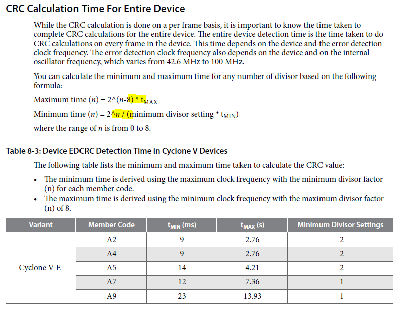 "While the CRC calculation is done on a per frame basis, it is important to know the time taken tocomplete CRC calculations for the entire device. The entire device detection time is the time taken to doCRC calculations on every frame in the device. This time depends on the device and the error detectionclock frequency. The error detection clock frequency also depends on the device and on the internaloscillator frequency, which varies from 42.6 MHz to 100 MHz."
