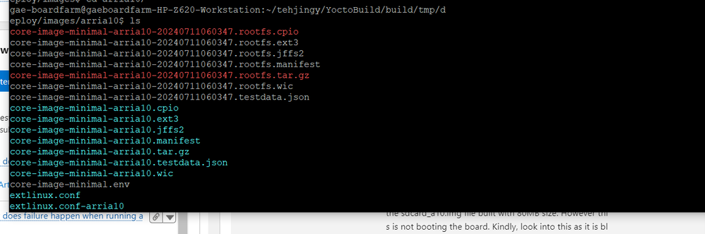 In the documentation, it is mentioned that core-image-minimal-arria10.tar.gz will be generated under below path after running above bitbake command