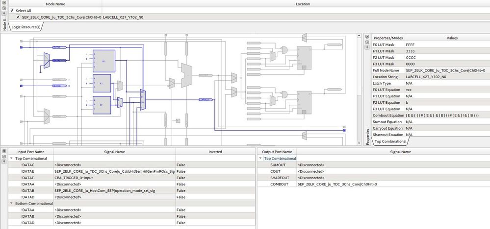 All above comments are just about this simple project creatation. Now let's go back into my primary question about the inside connections of the cell/node. The following image shows the inside of the cell (ALUT). This is very simple, there is only one input signal is fed into this ALUT. It is connected to DATAC of the ALUT. My question is, if ECO is not allowed to use for Cyclone 10GX, is there any other ways to control the input signal to connect to the ALUT input ports? You know I have total 3 I/O input signals, I want to control them to connect the same ALUT input ports, for examle, all connct to DATAC, instead of one connects DATAA, one connects DATAB, and the last one connects DATAC. Which are uncertainty connection. What i need is fixed connection, then i can get almost same time delay for these paths.