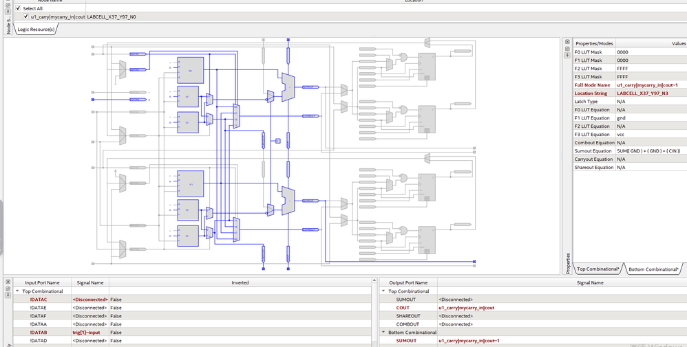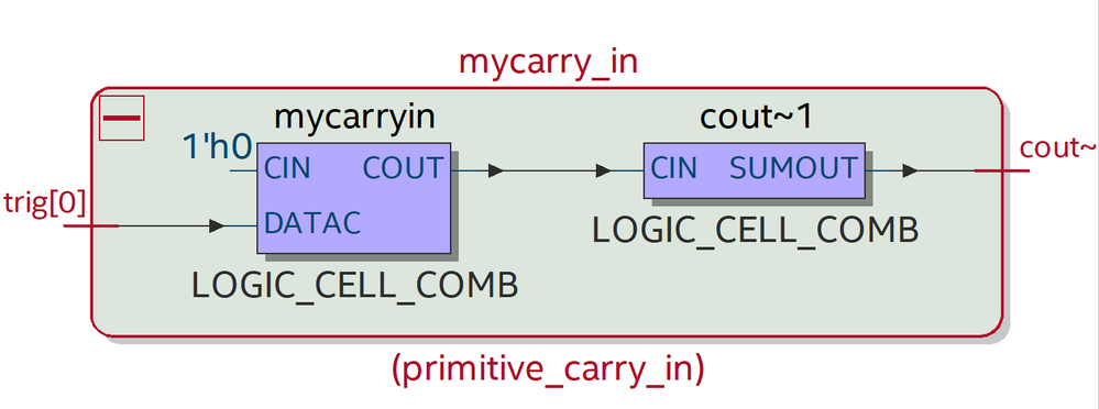 There are 3 I/O pins come from outside and they are fed into same logic module which is named as "carryin_test". Which is implemented as following image, so only two ALUTs are used to realize this module.