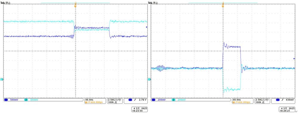 For LVDS transmitter, DC coupling should be ok. For CML transmitter, its common mode voltage should violate LVDS specifications which are give in Cyclone 10 GX device datasheet. As figure 8 indication, the CML differential signal were measured in AC coupling mode. The left of figure 8 shows the signal before capacitor, the right one shows the signal after AC coupling capacitor. The primary common mode voltage of CML signal is about 2.7V. In DC coupling mode, even after on-chip 100ohm termination, the Vcm still has around 2.3V. Which is beyond the range of LVDS requirement (0~1.85V) given in device datasheet. So why can port 2 work well in this case?