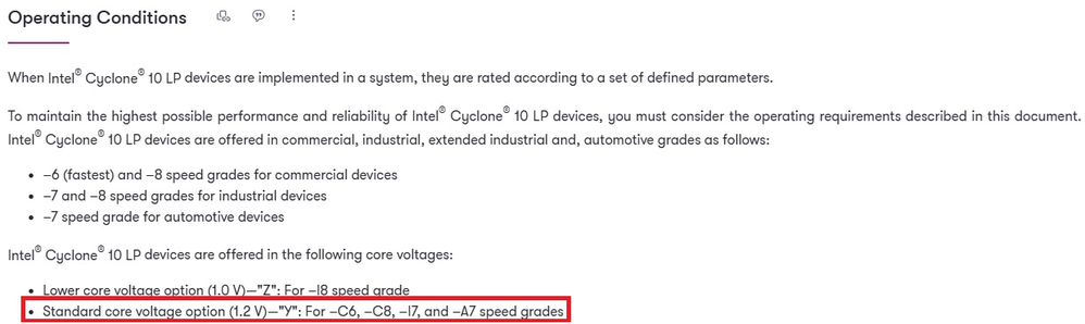 1. Yes, your understanding is correct. However, only selected Cyclone 10 LP OPNs support the Extended‑Industrial temperature grade, and these are the devices that use the core‑voltage option ‘Y’. Devices using the core‑voltage option ‘Z’ do not support the Extended‑Industrial temperature grade.