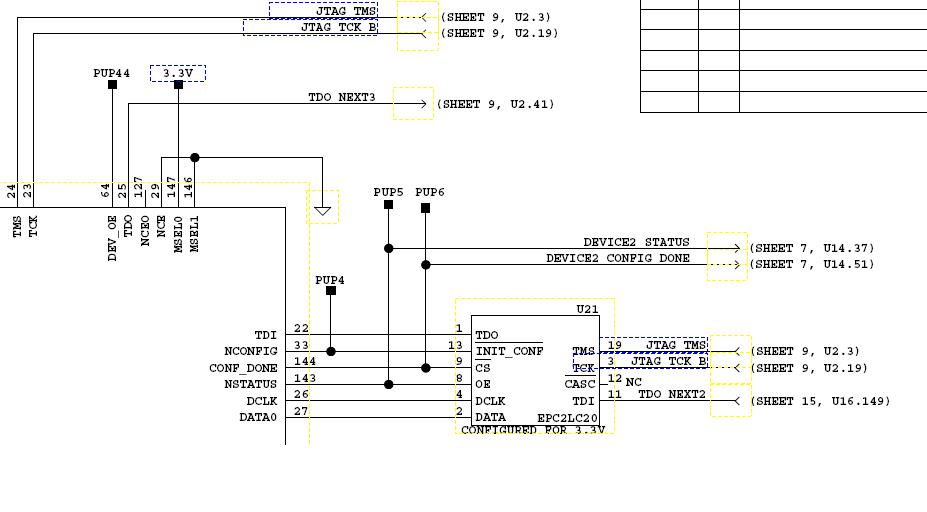 I am trying to configure 3 EP2C20 with 3 EPC2 device. The EPC2 device was configured with JTAG. So when the board power up the EP2C20 should be configured by the EPC2. The connection is as per the altera website's Passive Serial interface... nConfig: 10k ohm pull up nstatus: 10k ohm pull up conf_done: 10k ohm pull up MSEL1: GND MSEL0: 3.3V The JTAG chain has 6 devices in total: EPROM1, FPGA1, EPROM2, FPGA2, EPROM3, FPGA3. First I made a mistake of compiling the 3 devices with the option 'nCE0 as a programming pin' (i have it unconnected at the moment). The FPGA1 seem to be programmed (don't see nstatus and conf_done toggling) but not the other two. Then after I recompile all 3 devices with 'nCE0 as a i/o pin' option, all three FPGA's conf_done and nstatus seem to be toggling, but the overall conf_done signal seem to be OK. Please give me some advice? If there's anything not clear, please let me know. I will try to describe clearer if I can. Thanks so much in advance!! ETA: by the way, if I configure the 3 FPGAs with the *.sof file thru JTAG directly, there is no problem.