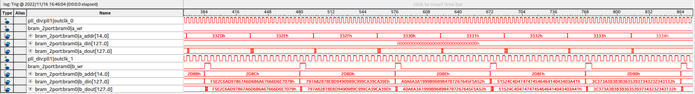 The SignalTap recording of the ports of the custom 2-port BRAM is in the next image: