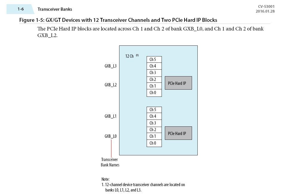 The C5 datasheet (cv_5v3-683586-670578) for XCVRs for this device in Figure 1-5 describes the XCVR configuration for our Cyclone V chip (a GT device with 12 XCVR channels). It says that Ch1-2 in both GXB_L0 and GXB_L2 are the "PCIe Hard IP" regions. However, the C5 DVK schematic (which I copied for our design), shows the PCIe signals connected to GXB_L0/L1 Channels 0-3. Channels 0 and 3 are not part of the PCIe Hard IP. Consequently, there appears to be a conflict between how the DVK PCIe lines are connected vs the recommended connection guidelines from the datasheet. Please clarify the proper connections to realize a PCIe 4X Gen2 (5Gbps).
