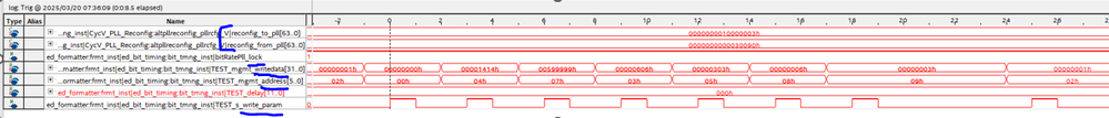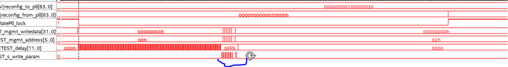 We are using a Cyclone V FPGA with an Altera PLL Reconfig and Fractional PLL IP modules via Quartus 22.1. Appnote AN-661 defines the connection and setup for the two IP blocks, along with the register definitions. Intel design example “pll-reconfig-mnc.qar” is another example file for implementing a Reconfig and fractional PLL, while showing a state machine to write to the Reconfig module. Pretty straight forward material, in which we have implemented nearly identical code to write to the Reconfig module. I have not simulated this, but instead used Signal Tap to show screenshots that match the AN-661(Figure 2) exactly. However I still do not see any change on the 64-bit output when we perform new writes with new PLL settings. I have tried resetting the module before and after the reconfig process per the below comment in the spec, but it made no difference. Also the Intel example did not issue any follow-on resets, but only shows a single programming cycle.