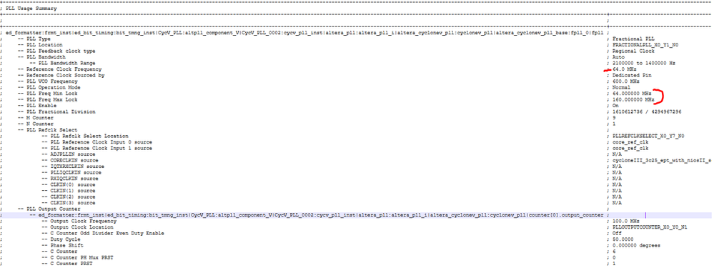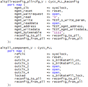 - Here is a pic zoomed out. You can Lock de-assert, but grouping for writes to the Reconfig module (blue demarcation), and then PLL re-assert. There is a change in the data structure of the reconfig_from_pll (63..0) vector just before it locks, but there is no big change in the data for a newly written PLL clock output setting.