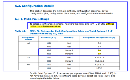 Hi there, we are using 10CL055YU484C8G, ALL 8 bank VCCIO=2.5V, VCCA=2.5V, VCC_core=1.2V We planned to use AS config scheme with standard POR delay, however, From latest Cyclone10 LP handbook, sect...
