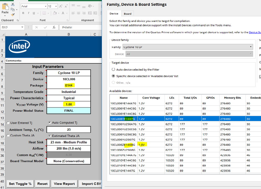 Below screenshot is an example: 10CL006 E144 Industrial that has part number using 1.0V and 1.2V