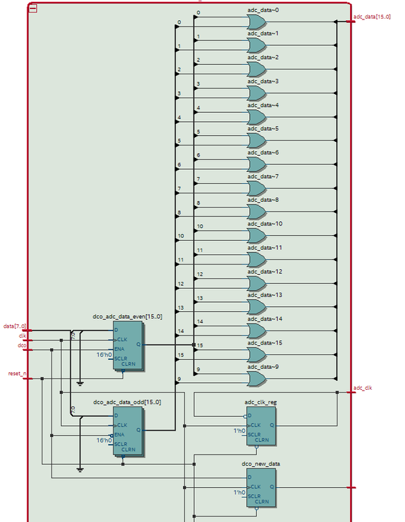 This is the rtl view that generates the 50MHz clock (adc_clk) and latches the data (data[7:0]) to two registers with odd and even data. To avoid muxes (is this a wise choice?) the two latch registers are filled with odd and even bits at the odd and even positions and then or-ed together: