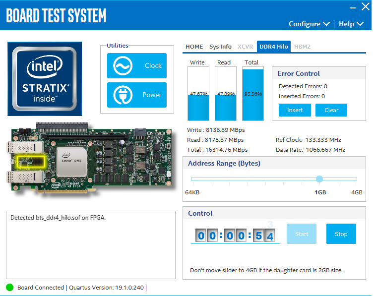 I am currently testing different interfaces of the device using the Board Test System (BTS) that is provided by Intel's Stratix 10 MX FPGA Installer Package - found online on the Intel S10 MX website.