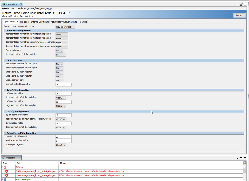 As I tested with the A10 Native Fixed Point DSP IP, I am able to replicate similar error with your configuration. After further debugging, I found that the right option for the ay' and by' operand source should be "preadder" for your target operation. After I switch to "preadder", the error goes away and the IP Block Symbol also looks correct. You can try on your side to see if it works.
