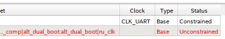 - After setting "ru_clk" to the same rate as "CLK_UART", I got a 'Failing path' warning when the Lanch Clock is the "ru_clk" and the Latch clock is the "CLK_UART". when I click on "Locate node in the design file", I'm taken to the IP-Core design files.