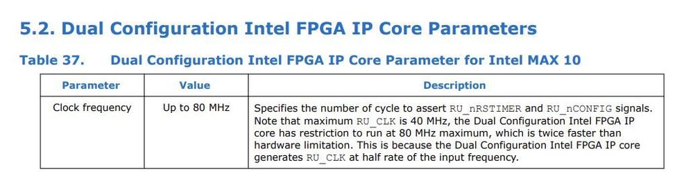 I'm using a 10M16SAU169I7G with "Dual Configuration" IP-Core. There is 1 Clock in the design and its rate is ~14[MHz].