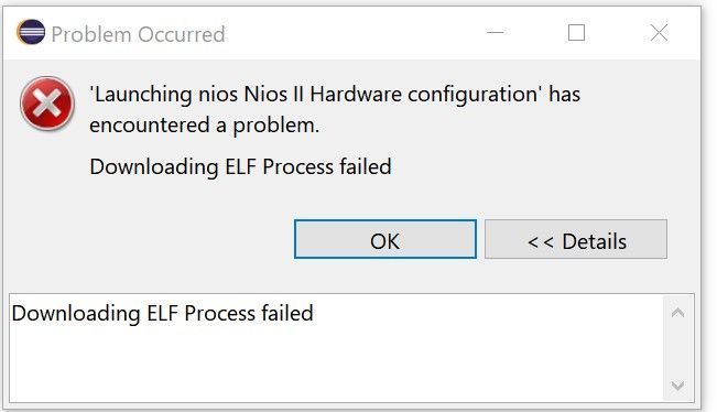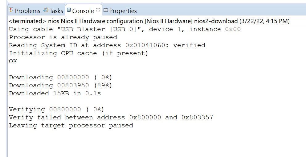 I have Quartus Lite 21.1 and eclipse but I had to install Quartus Lite 20.1 because I needed the sdram ip core which is not available in v21.1. Eclipse doesn't lunch from within Quartus 20.1, I dunno why. So I manually run it. I created a new workspace folder. I made a project with the sdram ip, nios, etc (Link to the project zip file). I can program the max10 configuration fine. I set a couple of leds on to show me that it is correct. It is. Now I'm trying to program the software from within eclipse but I keep getting the error in the picture below... the second picture is the console output. Can someone shed some light into my problem?