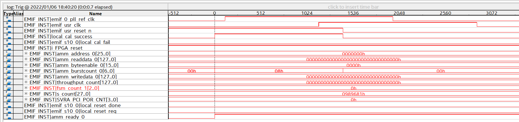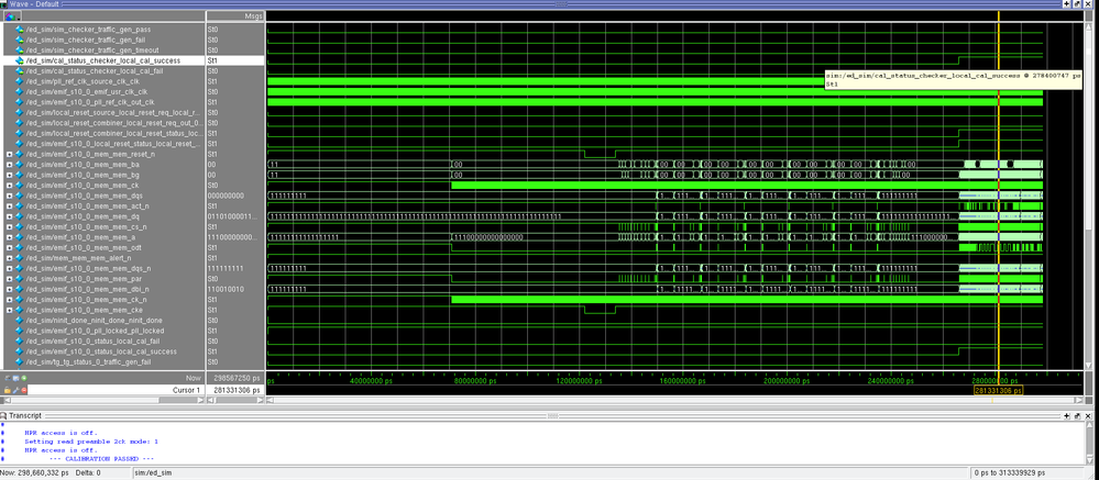 Hi, I have Generated example design for emif stratix 10 and simulation scripts too. While simulating in the modelsim ,every signal has default values only. even calib_success&fail both were low only!