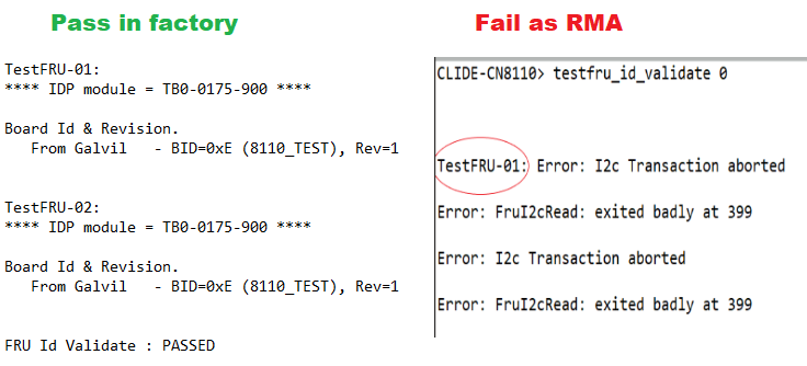 Customer reported: FRU1 Faulted. The unit booted up correctly, logs were retrieved The unit was vali Date Posted: November 27, 2023 Customer reported: FRU1 Faulted. The unit booted up correctly, logs were retrieved The unit was validated with Filler and TB0. FRU detection was validated, Slot 1 failed. Swap was done and the unit was validated again, failing same slot. FRU’s used during validation were M99441FD and M994C124, respectively before swap. Factory Reset was performed. Slot 1 remained failing. FRU0_SCL_SRC and FRU0_SDA were detected absent at Main Board. U91 was sent for replacement. Critical repair reported multiple damaged pads at removing BGA, and alerted the high risk of the repair process. This was escalated to Ciena, who authorized to continue with the repair. Pads of FRU0_SCL_SRC and FRU0_SDA signals were affected / damaged. This is a critical repair with its own risks. After repair, the unit was validated manually and still failed. The root cause of the field failure mode is damaged pads at U91 location. PN: EP4CGX110DF27I7N Qty: 2 Flex PN: N0230475