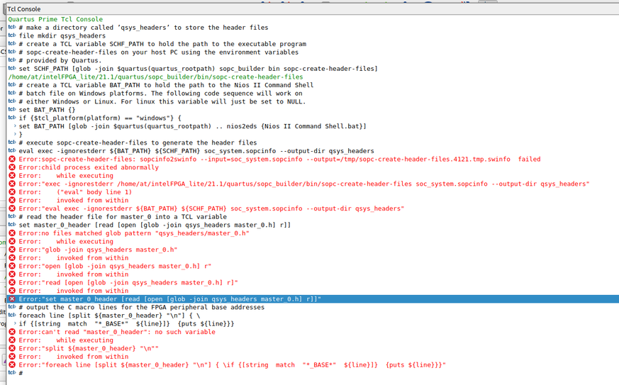 The final section of the tutorial is to generate header files and they given a code to paste into the Tcl console of the Quartus prime software. There is an error when I do so. This is how the Tcl console looks when I paste the given code.