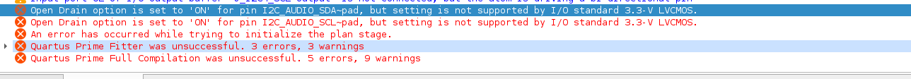 Error(20783): Open Drain option is set to 'ON' for pin I2C_AUDIO_SDA~pad, but setting is not supported by I/O standard 3.3-V LVCMOS.