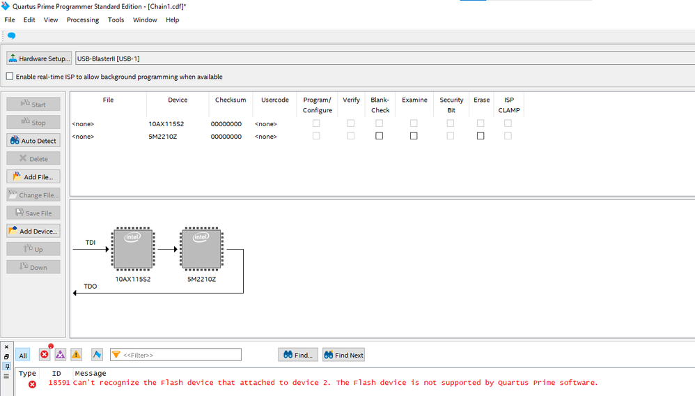 We have a new development kit ( Intel Arria 10 GX FPGA Dev board - DK-DEV 10AX115S-A). I can program the sof and do the initial fpga check with blinky LED. Now, I want to try programming the flash using a .pof file. Unfortunately I could not detect the flash in the board. Please see error message from quartus programmer. Can you let me know if I need to do something to be able to detect the flash?