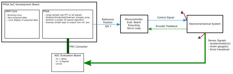 I'm looking for some advice with regards to the digital platform I will use for a graduate school project. I have also posted this question on the Digilent forums, so my apologies if you frequent both. brief project overview The aim of this project is to measure the dynamic response of a structure under artificial and/or operational stimulus, and semi-actively tune a dynamic vibration absorber to minimize said response. My chosen methodology requires computing the FFT of multiple sensor signals, performing a simple search on the processed data, and then executing a decision making algorithm to select which frequency the dynamic vibration absorber is tuned to. The worst-case scenario may require computing the real FFT of 4-6 signals over a running window of 1-2 seconds every 5-10ms, with a 24 bit ADC sampling at 10KHz. This is a bit of a contrived scenario, however useful for establishing an upper limit on the performance requirements. The simplified diagram below illustrates roughly what the process will look like. It would be nice to have the response time from electromechanical system output, A, to input B less than 10ms. my background Degree(s) in mechatronics, some experience with the MSP430, and some experience with the DE1 SoC development board for course work. A few courses in digital design and computer science using C++. chosen hardware… This is where you come in. So far I'm leaning towards an FPGA + ARM development board with the addition of an ADC development board so I can get right to development. I'm leaning towards an FPGA, because I want to learn.... these options look attractive:- de10-stanard (http://www.terasic.com.tw/cgi-bin/page/archive.pl?language=english&no=1081) ( ARM + FPGA )