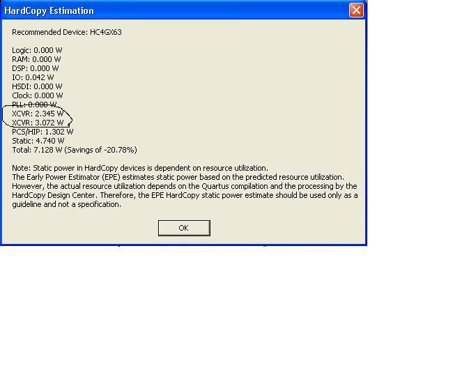 With the EPE V9.0SP1 B13, two different XCVR power numbers are shown and included for the HardCopy power estimation. The second XCVR power reported is the correct one for the HardCopy IV GX device; and it should match the Stratix GX XCVR power estimation. The first XCVR power listed in the JPEG you attached is incorrect. Please ignore the first XCVR power value. The correct XCVR power value for your design is 3.072W.