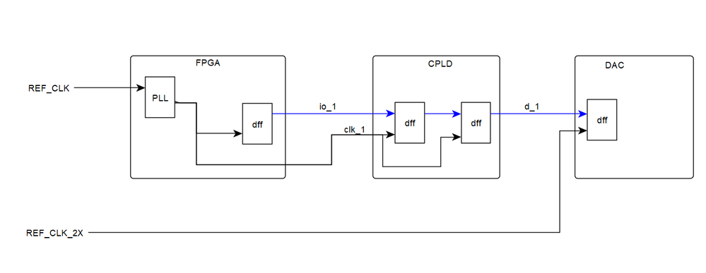I have trouble trying to constrain this design because I can constrain the io_1 in relation to the clk_1 from the FPGA side, making sure that the data transfer between the FPGA and CPLD respects the timing. However, how do I "create the clock" clk_1 going to the CPLD so that it is still related to the REF_CLK and REF_CLK_2X? I can't just use a simple create clock for clk_1 input of the CPLD because that will imply that clk_1 and REF_CLK have 0 phase offset, which is not true and that will make the output to the DAC's constraints false too.