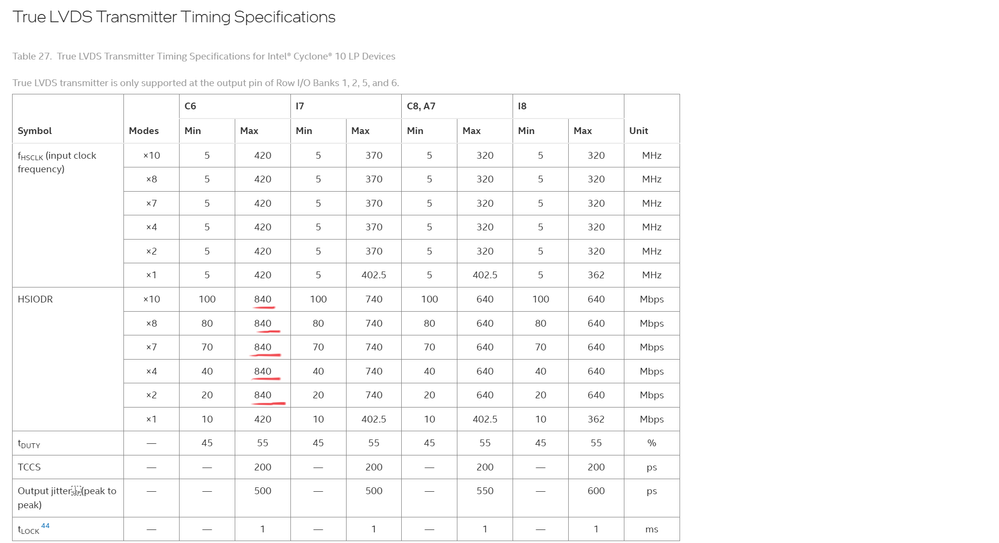 Does it possible to use ALTLVDS_RX/TX IP cores in Cyclone10 LP for 1GbE through SGMII interface. I've tried to make a test project but got an error that max transmitted speed is 840 Mbps.