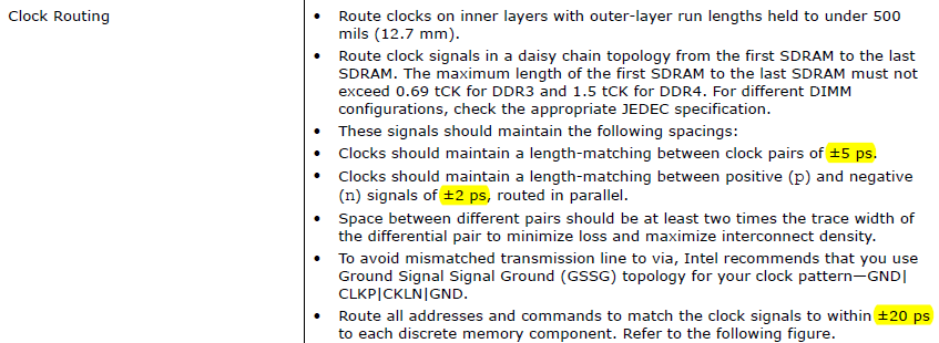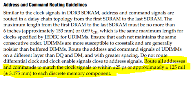 Routing for address and command routing, Intel recommendations is approximately ± 125 mil (± 3.175 mm) or within ±25ps to each discrete memory component. You may refer to “Layout Considerations For DIMMs and Leveled Components” on page 79 for more information about layout guidelines in above shared link. I also attached below screenshots on both clock , add/cmd routing to ease your viewing.
