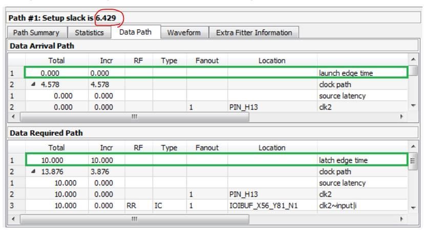 Your screenshots are not showing the whole picture (scroll to the bottom to get the data arrival and data required times; you've highlighted the clock edges, not the arrival and required times). Look at the Waveform tab in the timing analyzer reports. They show where the data arrival and data required times are located. Then correlate that to the numbers in the path reports in the Data Path tab.