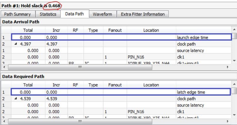 I'm having trouble understanding how to calculate Setup slack and Hold slack correctly. According to the Intel Quartus Timing Analysis manual, Setup slack is calculated as Data Required Time (Setup) minus Data Arrival Time, and Hold slack is calculated as Data Arrival Time minus Data Required Time (Hold).