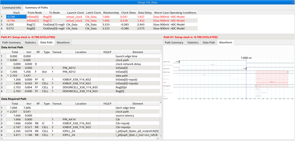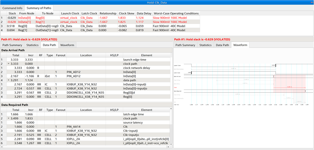 # Define input clock parameters set period 3.333 set tsu 0.4 set th 0.5 # Define input delays set half_period [expr $period/2] set in_max_dly [expr $half_period - $tsu] set in_min_dly [expr $th - $half_period] # Create virtual launch clock create_clock -name virtual_clock -period $period # Create physical base clock (phase shifted by 180 degrees) on FPGA pin create_clock -name Clk -period $period -waveform "$half_period $period" [get_ports Clk] # Create generated clocks on the PLL outputs derive_pll_clocks # Set input delay constraints set_input_delay -clock [get_clocks virtual_clock] -max $in_max_dly [get_ports InData*] set_input_delay -clock [get_clocks virtual_clock] -min $in_min_dly [get_ports InData*]