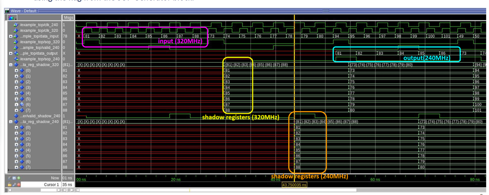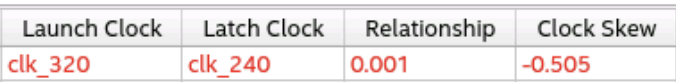 One can notice that despite the fact that source and destination registers are running at 320 MHz and 240 MHz, the data are refreshed every 40 MHz cycles. When one takes into account the fact that the clock enable is asserted periodically only once at 25 ns at both ends, one can consider this transfer very similar to a 40 MHz intra-clock transfer. However, without a suitable timing constraint, the STA tool is unable to guess this information.