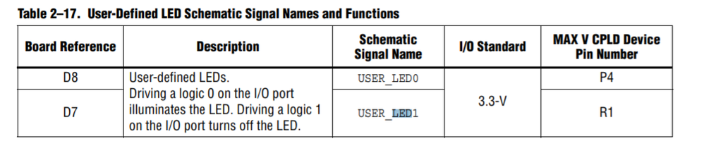 Do you mean you refer to MAX V CPLD Dev board reference manual? Below table shows the description for the LED. Driving a logic 1