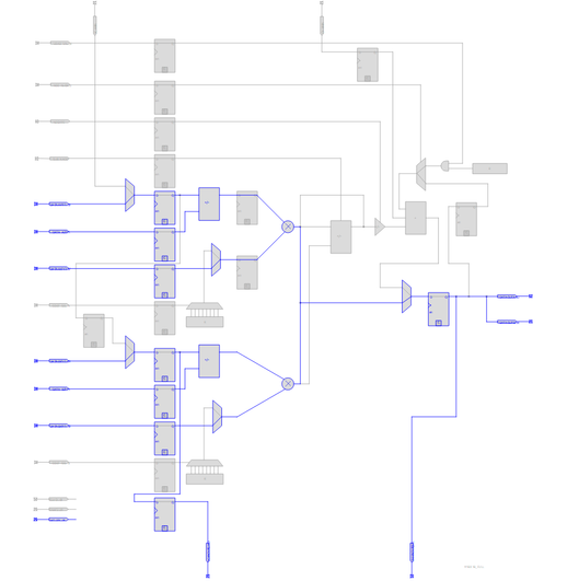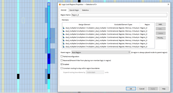 The highlighted dark blue lines depict the LL region which consists of the 7 DSP blocks (which I gave a light blue color). In the Logic Lock properties you see the design elements that I added and also the excluded element types which gives the fitter more freedom.If we now look into the Technology map viewer we see that the fitter successfully uses the two multipliers from each DSP block and also bypasses the adder.