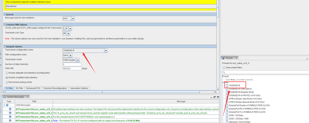 - 1 Thank you very much, I've noticed the options in the NATIVEPHY IP GUI called "transceiver link type",But here's the explanation is RS :Chip to chip coummunication ;I don't know if this is the same as the" sr" in the 10gbase r protocol,