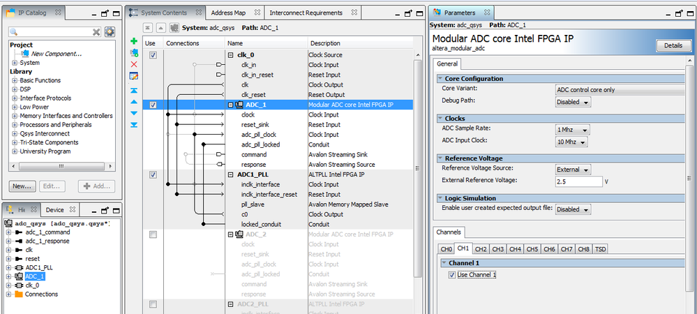 component adc_qsys is port ( adc_1_command_valid : in std_logic := '0'; -- adc_1_command.valid adc_1_command_channel : in std_logic_vector(4 downto 0) := (others => '0'); -- .channel adc_1_command_startofpacket : in std_logic := '0'; -- .startofpacket adc_1_command_endofpacket : in std_logic := '0'; -- .endofpacket adc_1_command_ready : out std_logic; -- .ready adc_1_response_valid : out std_logic; -- adc_1_response.valid adc_1_response_channel : out std_logic_vector(4 downto 0); -- .channel adc_1_response_data : out std_logic_vector(11 downto 0); -- .data adc_1_response_startofpacket : out std_logic; -- .startofpacket adc_1_response_endofpacket : out std_logic; -- .endofpacket clk_clk : in std_logic := '0'; -- clk.clk reset_reset_n : in std_logic := '0' -- reset.reset_n ); end component adc_qsys; U_ADC_SYS : adc_qsys port map ( clk_clk => s_pll_clk_10M, reset_reset_n => '1', adc_1_command_valid => adc1_com_valid, adc_1_command_channel => adc1_com_channel, adc_1_command_startofpacket => adc1_com_startofpacket, adc_1_command_endofpacket => adc1_com_endofpacket, adc_1_command_ready => adc1_com_ready, adc_1_response_valid => adc1_resp_valid, adc_1_response_channel => adc1_resp_channel, adc_1_response_data => adc1_resp_data, adc_1_response_startofpacket => adc1_resp_startofpacket, adc_1_response_endofpacket => adc1_resp_endofpacket );
