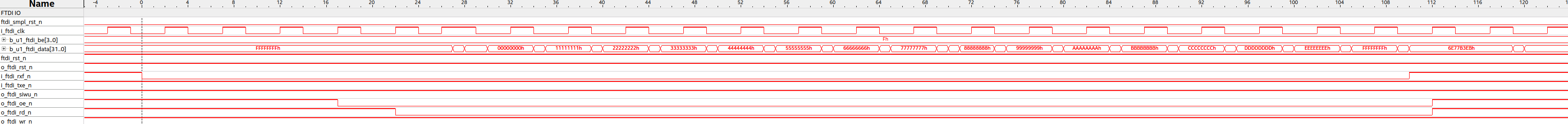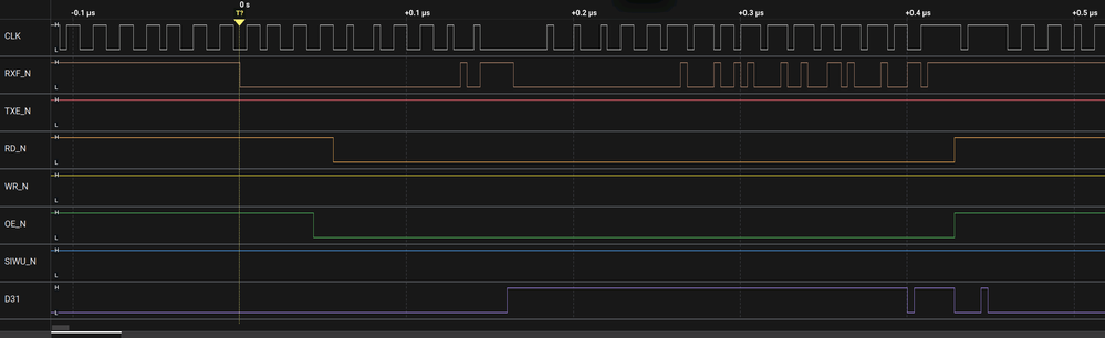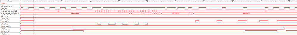 I was able to sample the FTDI clock and other interface signals with high a 333.33 MHZ clock. The FTDI clock is 66mhz. I see the same behavior is RXF_N is asserted (low) earlier than when valid data is available. This is the same behavior I was seeing in earlier testing. i.e. RXF_N seems to be widened by a FTDI clock cycle. I have attached signaltap snapshot. for the initial input data coming from FTDI.
